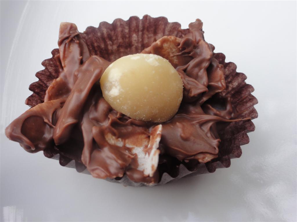 Large coconut flakes surrounded by hand tempered chocolate and topped off with a macadamia nut.